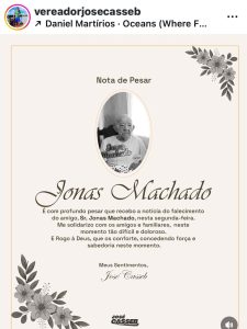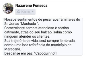 Nas redes sociais, a partida de Seu Jonas Machado repercutiu. O vereador José Casseb publicou: