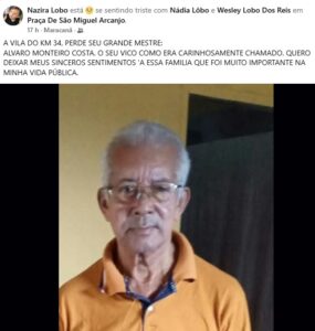 Com grande Pesar que a comunidade do KM 34 da rodovia PA 127, a estrada de Maracanã, lamentou demais o falecimento de Alvaro Monteiro Costa, conhecido como Vico do 34. Vico era um homem querido e respeitado em sua terra natal, conhecido por sua hospitalidade e bondade. Como comerciante e agricultor, ele trabalhava arduamente para sustentar sua família e contribuir para o desenvolvimento da região.