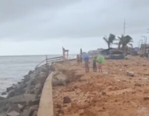 Na manhã da última quinta-feira, 5 de março, outro episódio chamou atenção e ampliou a preocupação da população. Parte do muro de contenção da orla da Praia de Ajuruteua, recentemente construído para proteger a faixa costeira, acabou cedendo diante da força das águas e da erosão provocada pela maré elevada.