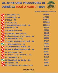 Segundo dados do IBGE e levantamentos recentes, os 20 municípios que mais produzem dendê são: