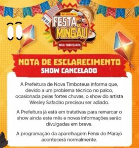 O cantor nacional Wesley Safadão, que estava programado para se apresentar, chegou ao local no horário previsto, mas devido aos riscos, o evento precisou ser cancelado. Os equipamentos do cantor foram danificados e havia risco de choques elétricos no palco, já que vários equipamentos estavam energizados. A organização havia preparado uma estrutura grandiosa, com uma grande quantidade de mingau servida aos presentes, ornamentação e segurança perfeitas.