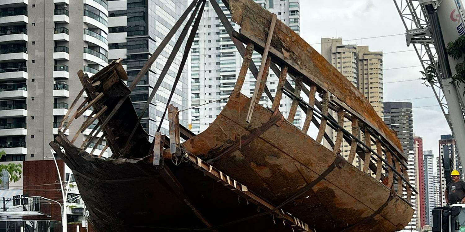 A proa de uma embarcação que estava enterrada em meio às obras da Nova Doca, na Avenida Visconde de Souza Franco, em Belém, foi retirada na segunda-feira (13/1), por volta das 22h. O achado arqueológico, encontrado em 12 de agosto do ano passado e que remete ao final do século XIX, deverá ficar exposto no Memorial Amazônico da Navegação, localizado no Mangal das Garças, na capital paraense.